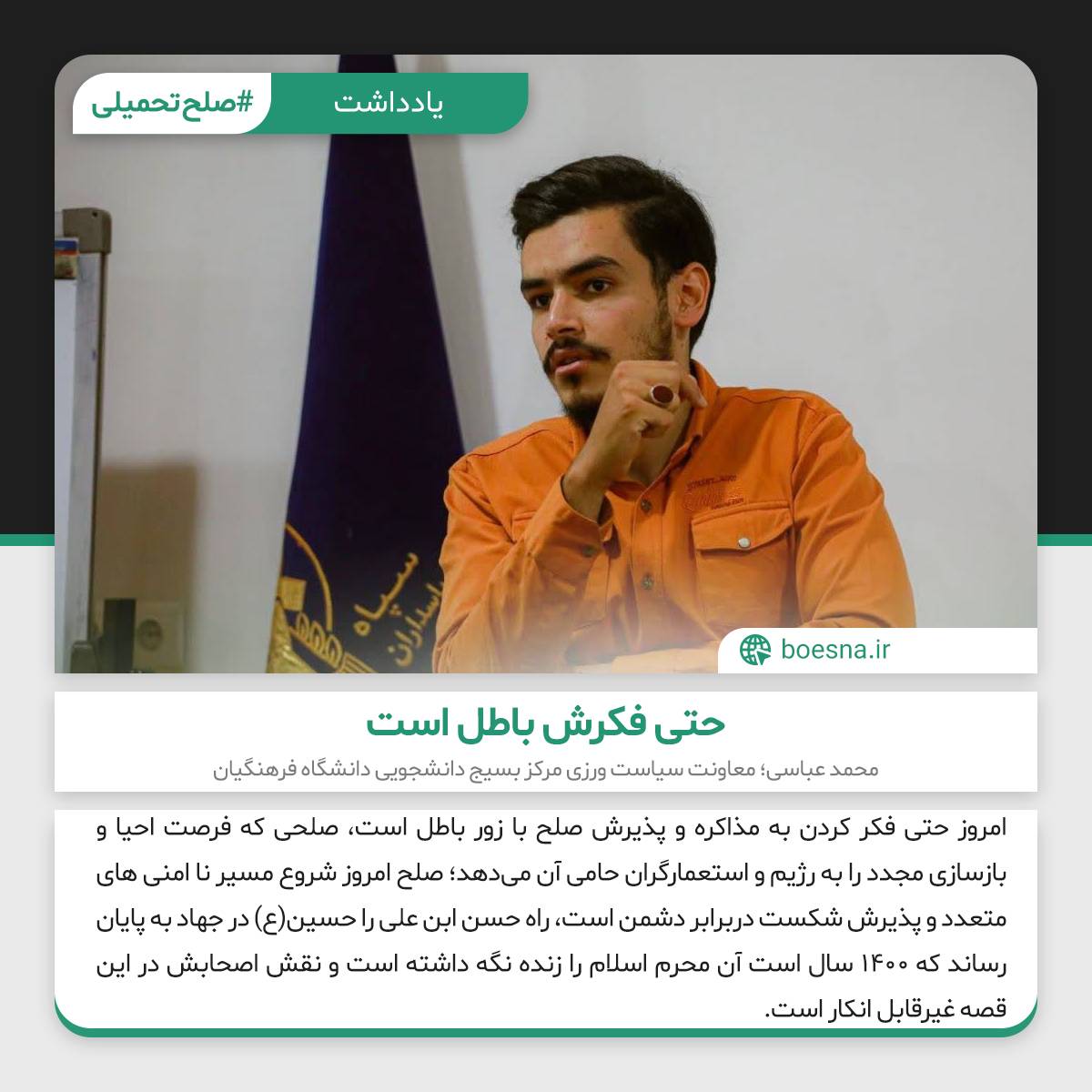 حال در این حین که جنگ را بر ما تحمیل کردهاند؛ با مذاکره و پذیرش صلح نه تنها در راستای جهاد با کفار پیش نخواهیم رفت، بلکه این صلح تحمیلی که روزی بر علی (ع) و روز دگر بر حسن(ع) تحمیل شد را می پذیریم و با پذیرش آن چیزی جز از دست دادن بدنه اجتماعی انقلابی برای ما باقی نخواهد ماند، جام زهر را باید شکست؛ تاریخ به ما ثابت کردهاست که آنها هیچگاه با صلح و مذاکره منافع خودشان را ازدست نخواهند داد و به اعتبار قراردادهای دست نوشت خودشان استعماری نو را پیاده سازی میکنند، مطالعه حکومت پهلوی و قاجار مهر تاییدی بر این موضوع می باشد.
